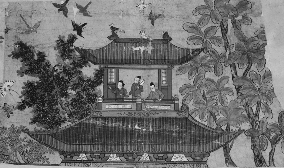 “一类中国地方风格”又被称作吐鲁番画派。这一风格主要以没有背景装饰的人物画为主,而部分作品被认为在绘制时使用了芦杆笔(如H.2153, fol.48a, 149b)。有些中国建筑的形象源自界画中的亭台楼阁,但论工艺细致程度却与宫廷画院出品的界画有着云泥之别(如H.2153, fol.35b, 128b-129a)。 (图14)威廉·沃特森认为,这些作品可能出自以吐鲁番为中心的或是中亚的地方画师之手。