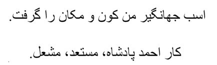意为:吾之坐骑贾汗戟尔( Jahangir) ,征服寰宇。齐备者与炽焰者之帝王艾哈迈德之作。