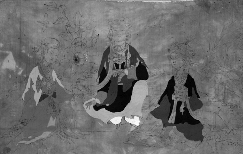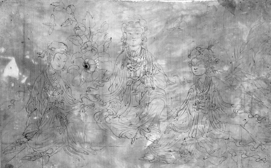 在雅库布册页中的众多绢本“中国画”中,有一幅三女座像图稿十分耐人寻味,杉村栋将此图命名为《三仕女图》(图27)。这幅位于册页第66b页上的画稿绘于绢布之上,三位具有中国仕女形象的人物用胭脂红色的细线勾勒而成。其中左右两侧的仕女半侧身而坐,位于正中的仕女正身而坐,三人的“自在坐”坐姿和配饰都与佛像有几分相似,譬如现藏于日本东京国立博物馆的14世纪南北朝时代良全( Ryouzen)所绘的《如意轮观音图》 (图28) ,或现藏于美国奈尔逊阿特金斯博物馆的辽代木雕精品水月观音像(图29) 。