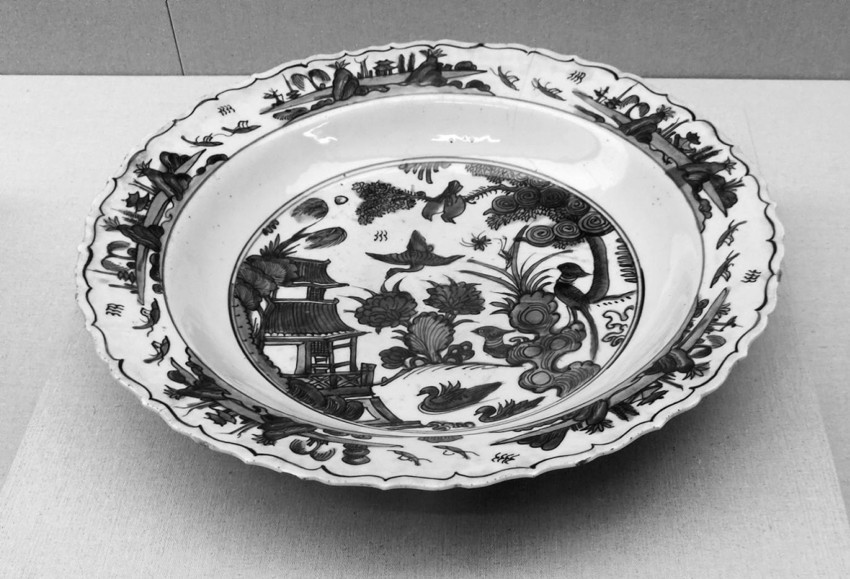 而笔者认为这部分绘画内容和形象来源亦有可能是流入波斯宫廷的中国瓷器上的图像纹样,即中亚或波斯画师以中国外销瓷上的图像为蓝本进行的再创作。因为画面中的植物枝叶硕大,与建筑和人物的比例极不协调,而通过比较可以看出这种情况也存在于同时代的中国青花瓷上。 (图15)