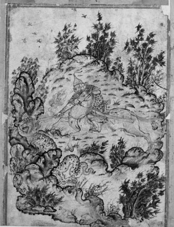 图34 《巴赫拉姆屠龙图》,14世纪贾拉伊尔画派,伊朗或伊拉克,雅库布册页,TSM H.2153, fol.48b。