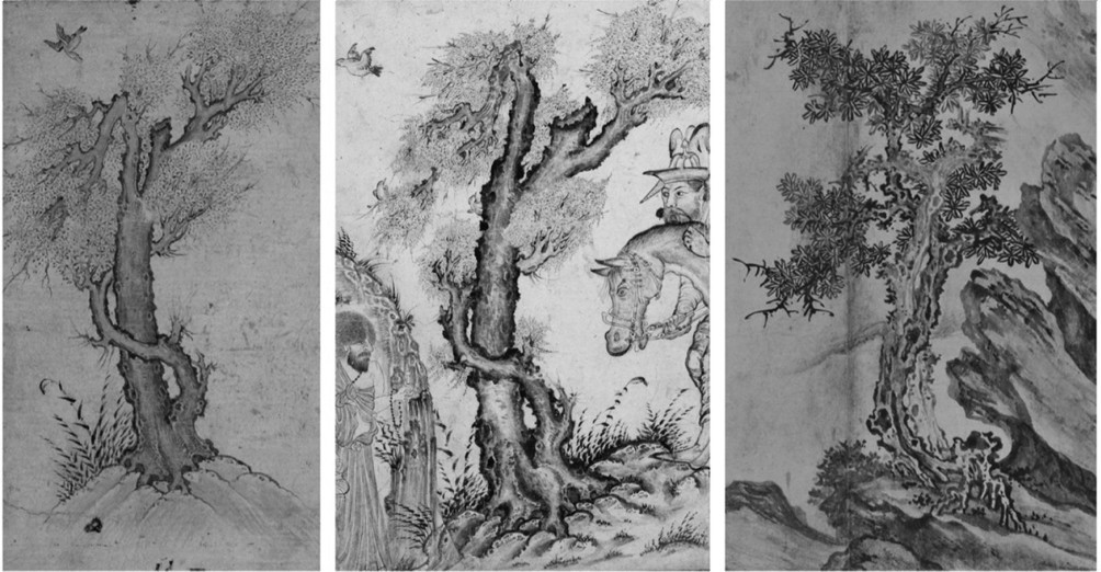 图36 黑笔画中的树木与中国水墨画中树木对比(右1:白莲社图卷(局部),张激,34.9×848.8 cm,辽宁美术馆。)