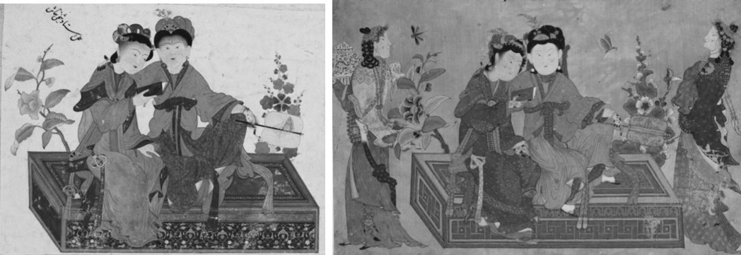 13和14世纪的蒙古四大汗国时期,中国的艺术品通过撒马尔罕进入波斯,随之而来的是短暂的东亚艺术审美趣味对伊斯兰世界的冲击。虽然波斯艺术家对远道而来的中国艺术品产生了浓厚的兴趣,并开始学习借鉴和临摹,但在艺术创作中这些艺术家仅限于吸收中国作品中的非宗教成分,当然他们可能对中国艺术品的宗教属性和社会文化内涵并不感兴趣抑或是无法理解。正如杉村栋博士所写的一样:“一幅作品中对于中国画家来说重要的点,在临摹这幅画的中亚或伊朗艺术家看来毫无意义。甚至这些重要的点要么被直接忽视掉,要么被他们自己的绘画语言和想法重新回炉加工成了全新的面貌。”
