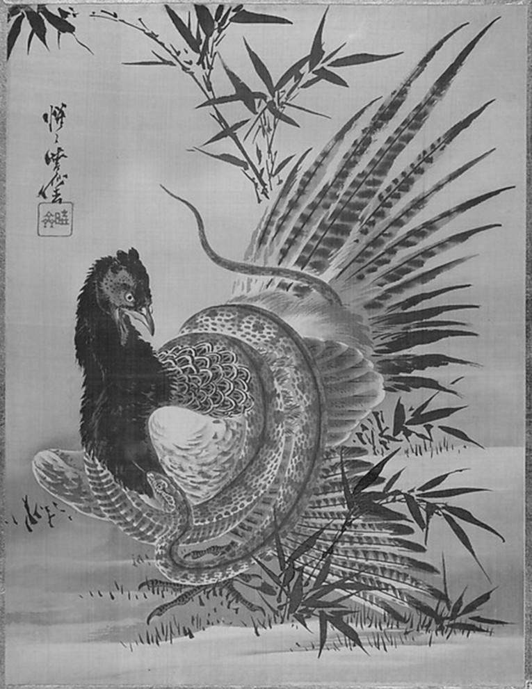 图41 《雉鸡降蛇图》, Kawanabe Kyosai, 36.2×27.6 cm, 1887,纽约大都会艺术博物馆(NYMMA), 14.76.61.17。