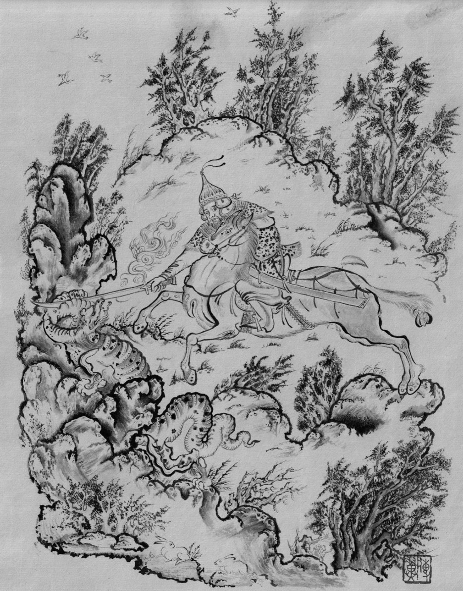 图39 笔者临摹的贾拉伊尔黑笔画巴赫拉姆屠龙图
