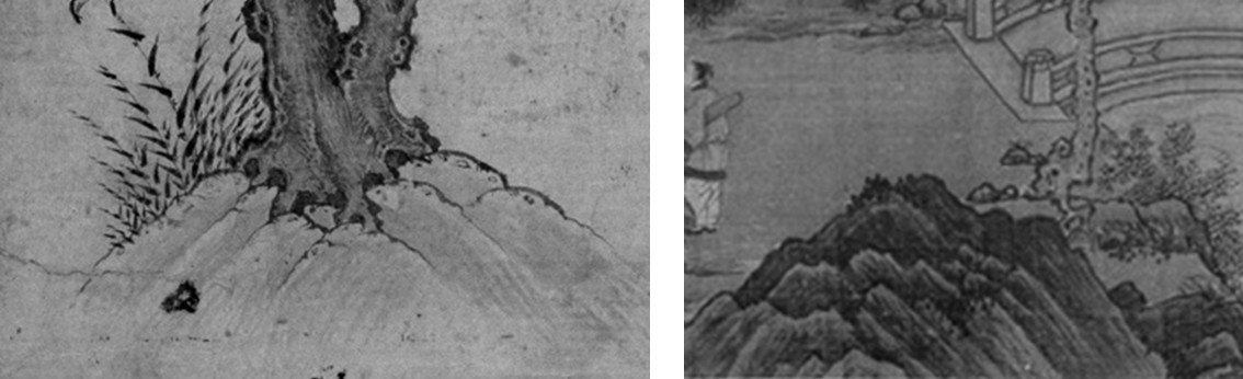 图37 黑笔画中的岩石与中国水墨画中山石对比(右1:西园雅集(局部),刘松年,24.5×230 cm,台北故宫博物院。)