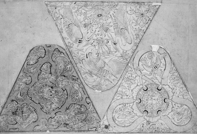 萨莱册页中藏有若干幅画在三角形或云肩形状内的图案和装饰性绘画,这些黑笔画稿有些没有上色,有些简单涂染了部分图案(如太湖石) ,对比16世纪波斯青花瓷上的纹样后,笔者认为这些设计图稿有可能是为瓷器图案或瓷器光子画所创作的粉本作品。 (图44、45)