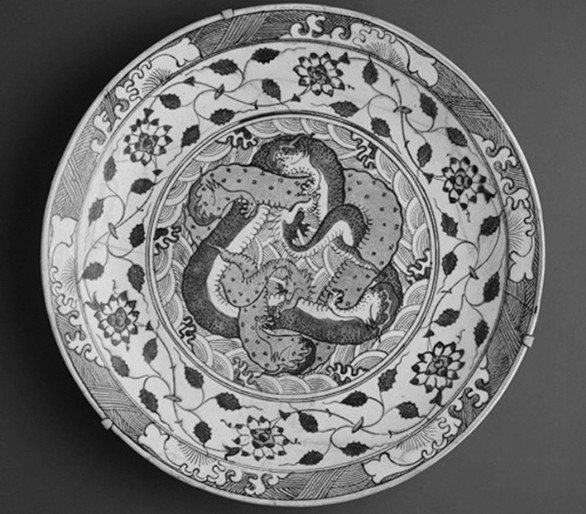 图44 双龙纹青花盘,伊朗科尔曼,1640, NYMMA, 65.109.2。