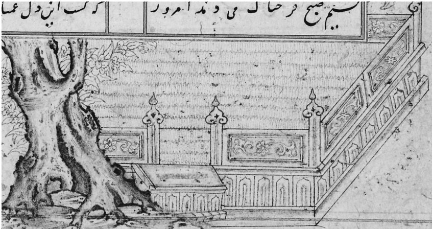 这些中国画和青花瓷中的太湖石形象直接或间接地成为波斯细密画、黑笔画和图案设计中的新元素,这些素材很有可能通过伊利汗王朝时期蒙古人的贸易或礼品往来流入中西亚地区。而后来太湖石又以新的面貌出现在贾拉伊尔、帖木儿宫廷赞助下完成的绘画作品里,被画师们进行了本土化的融合。 (图42)