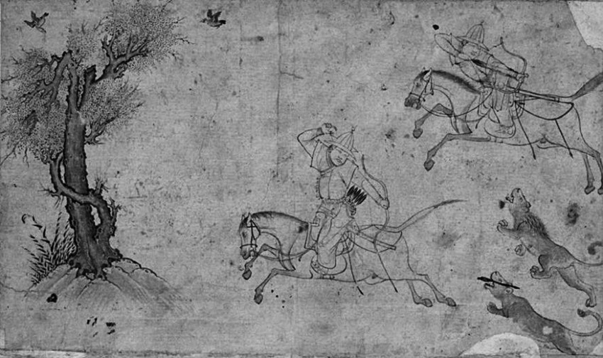 图33 《狩猎图》,14世纪贾拉伊尔画派,伊朗或伊拉克,雅库布册页,TSM H.2153, fol.158a。