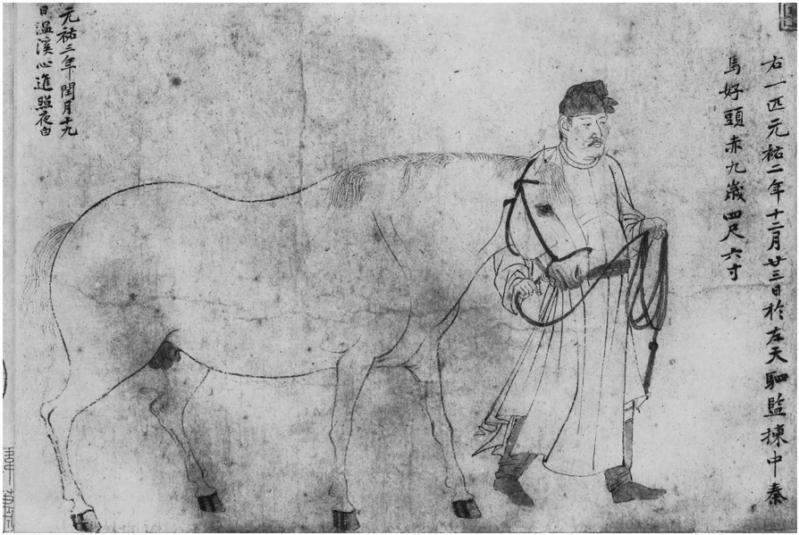 通过技法与内容的分析,笔者认为雅库布册页中的黑笔画的制作年代应该在14世纪上半叶到15世纪初之间。其中年代最早、具有明确断代信息的是埃米尔·德弗莱特亚的作品,约完成于14世纪上半叶。宋式铠甲的刀马人物画、贾拉伊尔画派的黑笔画有可能绘于14世纪末。