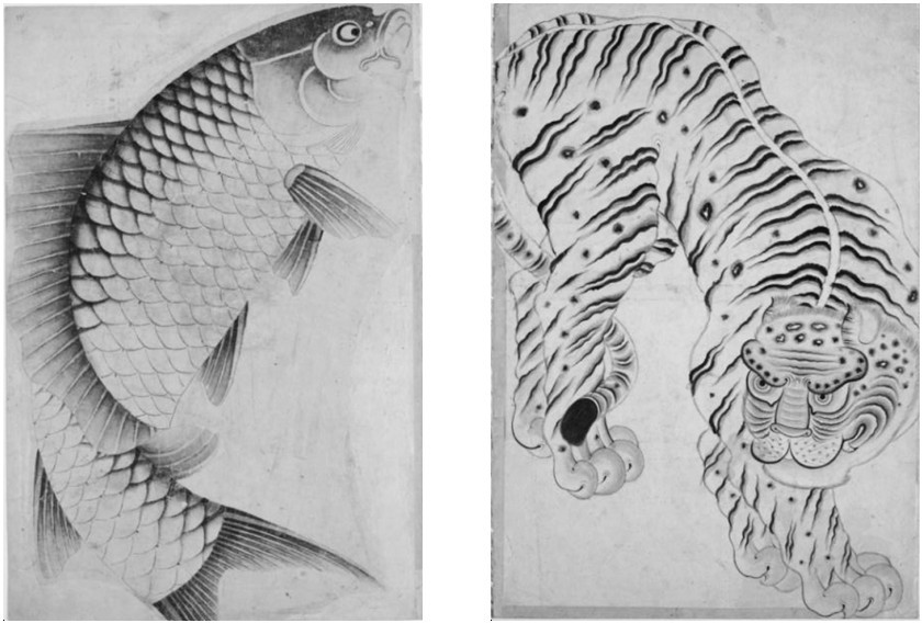 图18、19 水墨鲤鱼和老虎图,雅库布册页,TSM H.2153, fol.93a,89b。