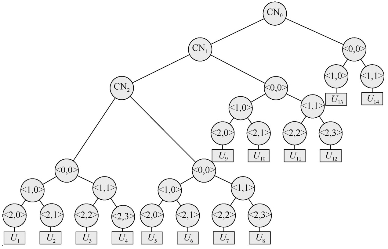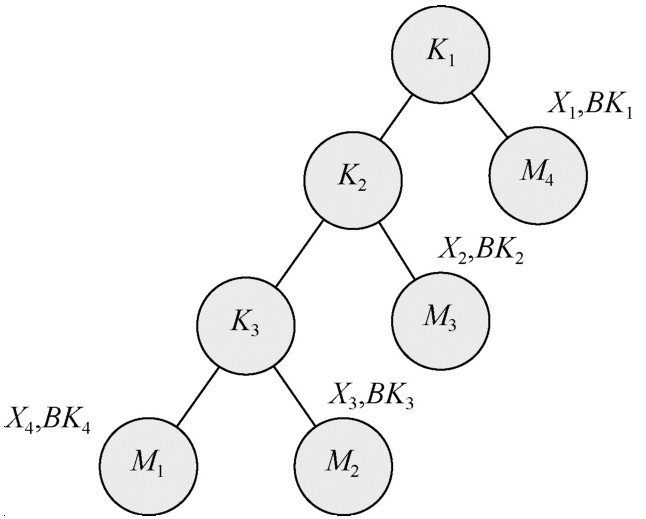 文献[ 135 ]提出一种结合 STR 和 TGDH 的方案( user-center Tree-based Goup Diffie Hellman,uTGDH)协议,如图2-13所示,uTGDH在椭圆密码曲线公钥的基础上,借鉴 STR 方案较少的通信负载和TGDH较少的计算开销与存储开销,密钥树整体构建STR,子树构造为二叉树,在网络时延和通信负载之间取得平衡,效率依赖TGDH子树和STR子树的规模,由于uTGDH在整体拓扑结构设计上仍是STR,所以子树规模不同,更新效率非均衡,层数越低的节点承担的计算开销和存储开销较大。