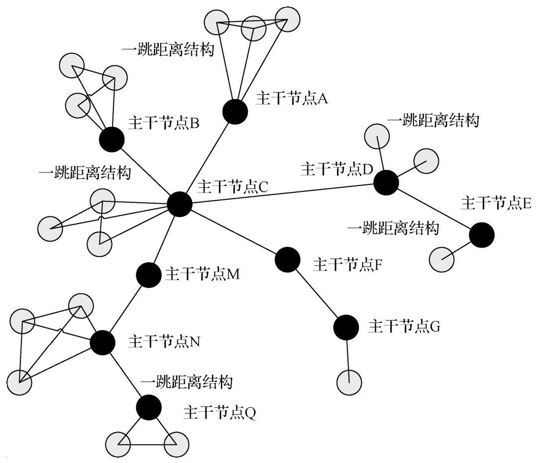 文献[124]提出了一种基于支撑树结构的群组密钥管理(Clustered Arbitrary Topology Generalisation of Diffie-Hellman,CAT-GDH)方案,根据传输范围将网络分为两层,如图2-9所示,每层都由多个簇构成,由簇节点组成第一层,簇头节点组成第二层,第一层使用伯梅斯特-德梅特(Burmester-Desmedt,BD)方案,第二层使用AT-GDH方案,协议效率为O(log 2 c),c为网络中簇的数量,虽然该方案使得密钥更新限定在局部范围内,同时降低树高度,但由于簇的规模和特定的信息相关,较大簇在群组密钥管理中需要耗费较多的时延,而且簇规模的不同,也导致其更新效率不同,进而破坏网络的均衡性。