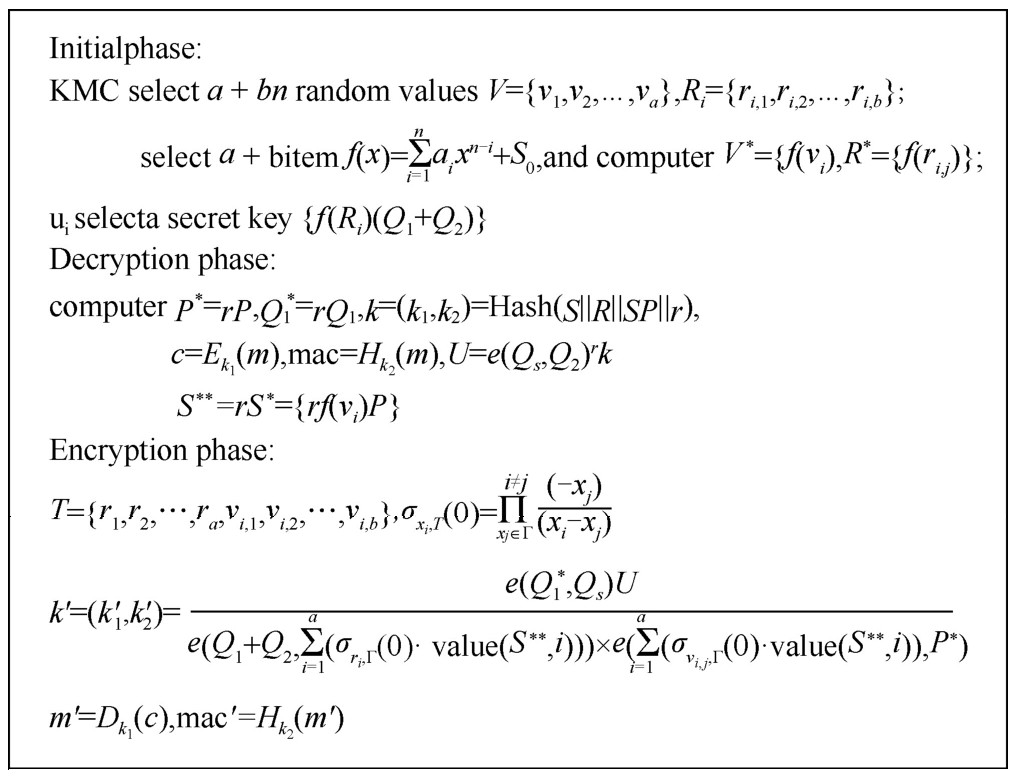 文献[111,112]基于双线性对和门限密钥协议提出了一种单加密密钥多解密密钥加密/解密协议(One-encryption-key and Multi-decryption-key/Encryption Decryption Key Protocol,OMEDKP),其算法如图2-6所示。该协议具有单加密密钥多解密密钥性质,通过KMC为加密者分配部分数量的加密密钥碎片(Key Fragment,KF),为解密者分配不超过门限数量的解密密钥碎片,只有当收集的解密密钥碎片超过门限值数量时,解密者才可以成功解密。每个成员具有不同的身份标识,根据该标识KMC使用门限函数为成员计算密钥碎片,因此每次密钥更新都需要重新执行一次协议,为加密者和所有解密者分配新鲜的加密/解密密钥碎片。