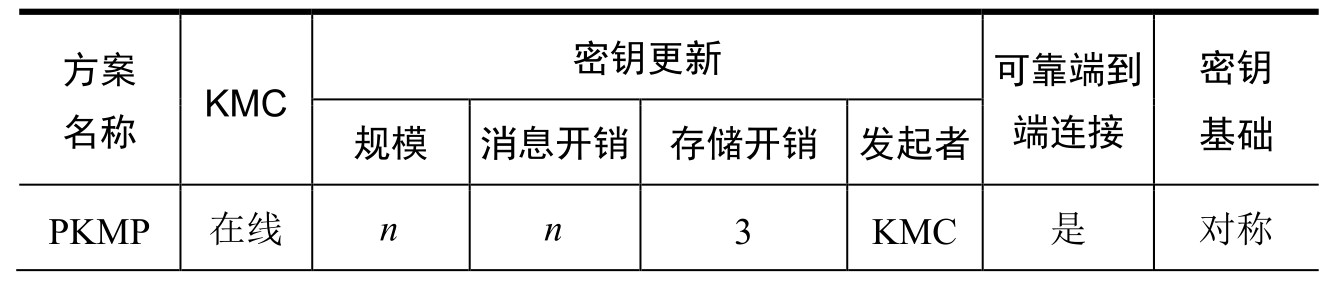 表2-3和表2-4给出了几种集中式密钥管理方案的安全性和效率对比。集中式方案成功实施的一个重要前提是,KMC 能够在密钥管理中和任何节点建立有效的端到端链接,节点的任何请求都能够被及时地送达到KMC,KMC的绝对安全性和较强能力简化了协议复杂度。KMC 是集中式密钥管理方案的核心,几乎所有的密钥管理任务都由KMC负责,因此KMC的能力一般比其他节点强,这也使得KMC的建立较为复杂和昂贵。由于KMC的重要性,它往往成为攻击者重点攻击的对象,是集中式密钥管理的安全瓶颈。为了避免KMC被攻击,以及减少网络成本,使用 KGC 提供密钥预分发的方案被提出。该方案需要节点预先配置大量的备选密钥,随机分配方式造成密钥更新的困难性,基于离线式KMC的密钥管理方案大多用于节点能力受限的场景,如节点的能力无法预先建立安全信道的场景,传感器网络因为节点能量水平不能支撑公开密钥算法建立安全信道。减少成员与KMC之间交互次数和防止单点失效问题是此类方案的研究核心。