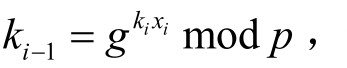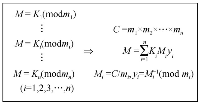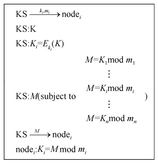 文献[110]提出了安全锁协议(Security Locks Protocol,SLP),当有节点离开网络时,KMC利用中国剩余定理(如图2-4所示)只需要一次广播协议就可以建立新KEK。如图2-5所示,安全锁协议算法减少了交互次数和消息量,增加了计算复杂度,具有单加密密钥多解密密钥的性质,但是存在单点失效问题。