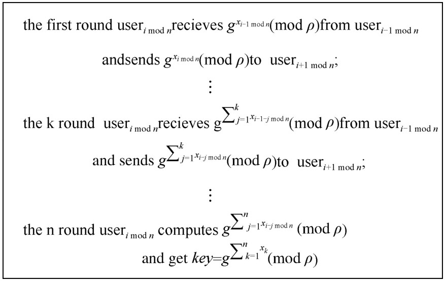文献[67]首先提出将 DH 协议应用于群组的密钥协商协议。成员具有执行DH协议的能力,每个成员通过DH协议在公开信道交互共享密钥材料以计算共享密钥,协议交互轮数开销为n轮,每个成员都需要发送消息n-1次,计算开销为n次模指数运算,如图2-10所示。由于该方案无须预先建立安全信道,因此一经提出,就得到了广泛的关注。该协议为两方DH协议扩展到多方的群组密钥管理协议奠定了理论研究基础。