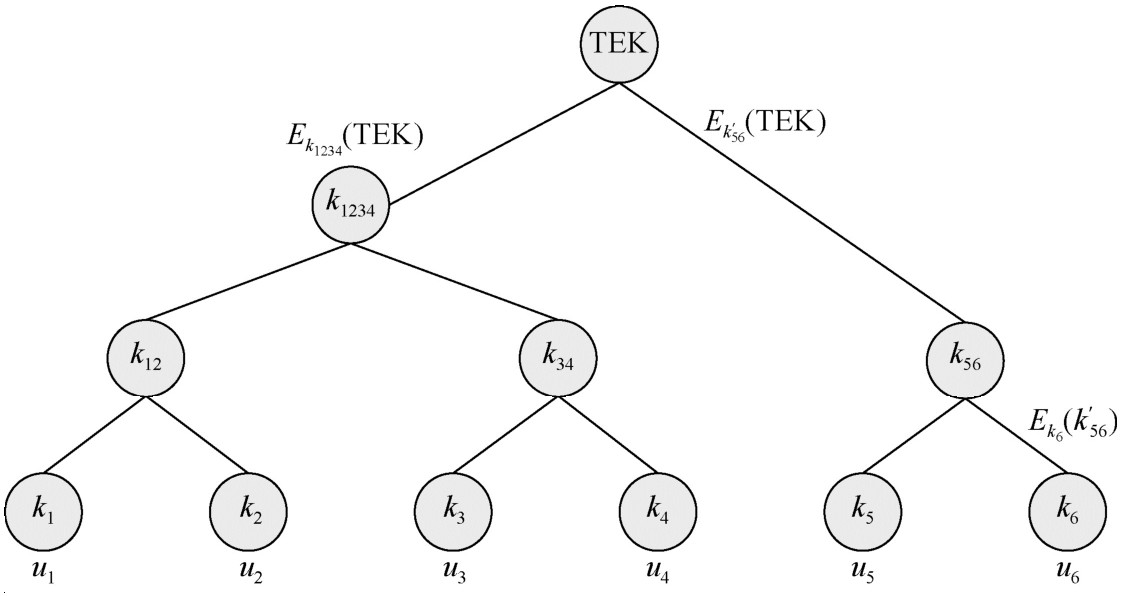 文献[105,106]解决了群组密钥可扩展性问题,提出逻辑密钥树LKH方案。如图2-3所示,在LKH中,所有密钥在逻辑结构上映射为密钥树,树中节点对应密钥,树中叶子节点对应群成员,群成员具有从叶子节点到树根的路径上的 KEK,树中根节点是传输加密密钥(Traffic Encryption Key,TEK),每个成员存储log 2 (n+1)个密钥,密钥更新的消息数量从n减少为log 2 (n+1) 。当节点u 5 离开时,密钥服务器(Key Server,KS)更新密钥k 56 ,KS使用k 6 更新节点u 6 的k 56 , KS使用k 56 更新节点u 6 的TEK,KS使用k 1234 更新其余节点的TEK,发送的消息量为3个,小于群组密钥管理(Group Key Management Protocol,GKMP)的消息量。针对此方案的系列优化方案被提出:文献[106]建议了一个LKH的扩展方案,将密钥树从二叉树变为k叉树,通过提高树的节点度减少树的深度,性能分析结果显示节点度的大小为4时,达到最优。文献[107,108]提出了 LKH 的改进方案单向函数树(One-way Function Trees,OFT),将密钥更新的消息数量从2log 2 N减少为log 2 N,其中KEK的计算不是从KS中得到,而是群成员利用单向函数 f (.) 、 g (.)和左右孩子的 KEK 计算得到k i = f ( g ( k left ( i ) ),g ( k right ( i ) )) 。文献[109]中使用伪随机数发生器产生 KEK,进一步提高了计算效率。