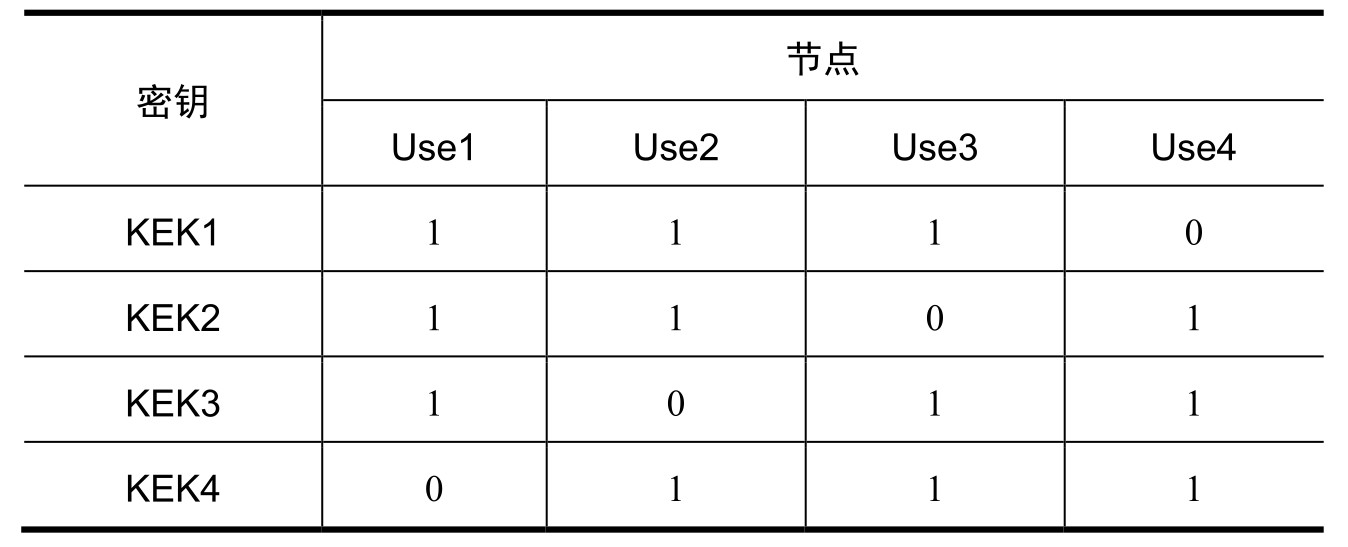 文献[72]提出了一种集中式二维表密钥管理(Centralized Fla-table Key Management,CFKM)方案,如表2-2所示。该方案中,密钥层次结构被一个二维表结构所替代,该表包括一个 TEK 和2w 个 KEK ( w为成员数量),当群成员变化时,只需要更新节点所持有的部分KEK,TEK通过未妥协KEK加密发送,更新的KEK使用未妥协KEK和更新的TEK加密发送,数量为<2w,减少了KS所需要维护的KEK数量。然而,密钥更新过程需要较多的通信负载。
