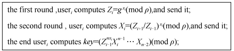 文献[91]提出了一种常数轮的密钥协商协议 BD 协议,如图2-14所示,BD 协议基于 DH 协议实现了密钥交互协议交互轮数与网络规模的无关性,交互轮数为常数级别。该协议只需要成员发送两次消息交互公开密钥材料,执行n+1次模指数运算,就能计算出共享密钥。但是BD协议需要同步机制支持。