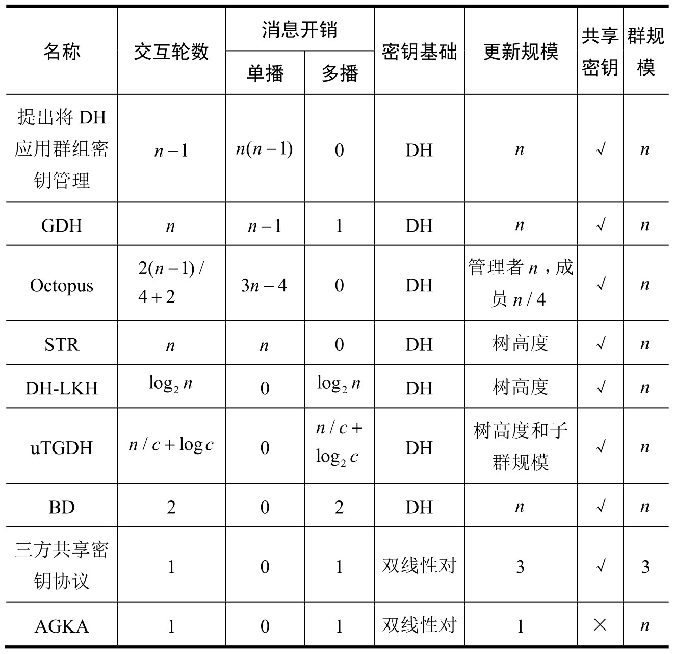 表2-6给出了几种分布式密钥管理方案的对比,分布式密钥管理方案是目前群组密钥管理的主要研究内容。分布式密钥管理方案无须特殊外部设备,无须密钥管理服务器支持和预制安全信道,密钥协商方式契合分布式网络自组织组网方式,支持网络成员的自由加入或退出,满足动态群组密钥管理的前向和后向安全性和密钥独立性需要,适合快速部署具有抗损毁的网络场景需求。由于共享密钥建立在公开信道基础上,目前大部分分布式密钥管理方案采用公钥密钥基础。因此,此类协议需要节点具有能够执行公钥的能力,增加了计算开销和消息开销,对网络资源提出了挑战,适合规模较小的分布式网络。目前,减少计算开销和消息开销是分布式密钥管理的主要研究内容,在安全性上,身份认证安全机制的建立和密钥独立性是其基础研究内容。