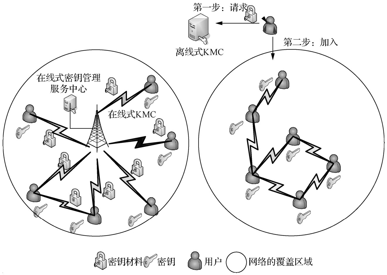 根据节点在密钥管理中的身份和承担的角色,地面无线网络密钥管理方案分为集中式密钥管理、非集中式密钥管理和分布式密钥管理。集中式密钥管理(Centralized Group Key Management,CGKM)方案的最主要特点是网络中存在能力明显优于其他成员的实体,如密钥管理中心或密钥分发中心(Key Generate Center,KGC),它们负责全网络成员的密钥生成、注册、组织、分配、更新和撤销等,承担全部或大部分密钥计算开销和存储开销,成员被动接收密钥材料,成员的所有信息对KMC或KGC都是可视的。集中式密钥管理根据KMC或KGC在密钥管理中存在的时间分为两种模式:在线式KMC,KMC在密钥管理中始终存在,KMC 能对成员的请求做出及时的反应;离线式KMC,KMC只承担密钥管理的初始化工作,当网络成员加入网络后,节点不能从 KMC 获取任何支持,因此离线式 KMC 的密钥管理能力是有限的,如图2-2所示。