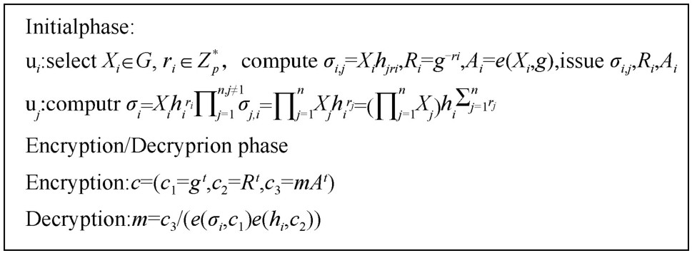 文献[138,139]基于双线性对和同态密钥机制提出一种非对称群组密钥协商(Asymmetric Group Key Agreement,AGKA)协议,如图2-15所示,该协议执行完毕后,所有群成员得到一个公开加密密钥,每个群成员具有该公开加密密钥对应的解密密钥,且每个群成员的解密密钥不同。公钥通过私钥材料组成,每个成员的私钥也由各个成员的密钥材料组成,因此当成员加入或退出时,需要所有成员共同重新执行密钥协议。由于每个成员具有对自己提供密钥材料的秘密签名