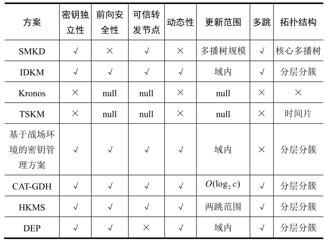 (9)可扩展性(Scalability),该指标主要考核动态网络中网络规模减小和扩张时的性能。该指标与更新规模具有密切相关性,具有较小更新规模的密钥管理方案具有较好的可扩展性。当网络发生合并或分裂时,网络性能不会因为规模变化剧烈而显著下降。可扩展性也指密钥管理在满足安全性的前提下,以较小网络资源消耗和较短延时完成密钥更新。可扩展性需要综合考虑网络的特殊应用背景。