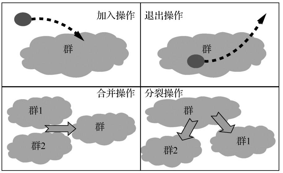 群组的动态性影响群组密钥的安全性 [99] 。当密钥的生存周期结束或发现密钥材料妥协,以及为了防止加入节点和退出节点的恶意行为时,群组密钥管理设计了4种群组密钥操作保护网络密钥的安全性,如图2-1所示。4种群组密钥操作的分类依据是能否形成物理连接和网络规模 [100] 。