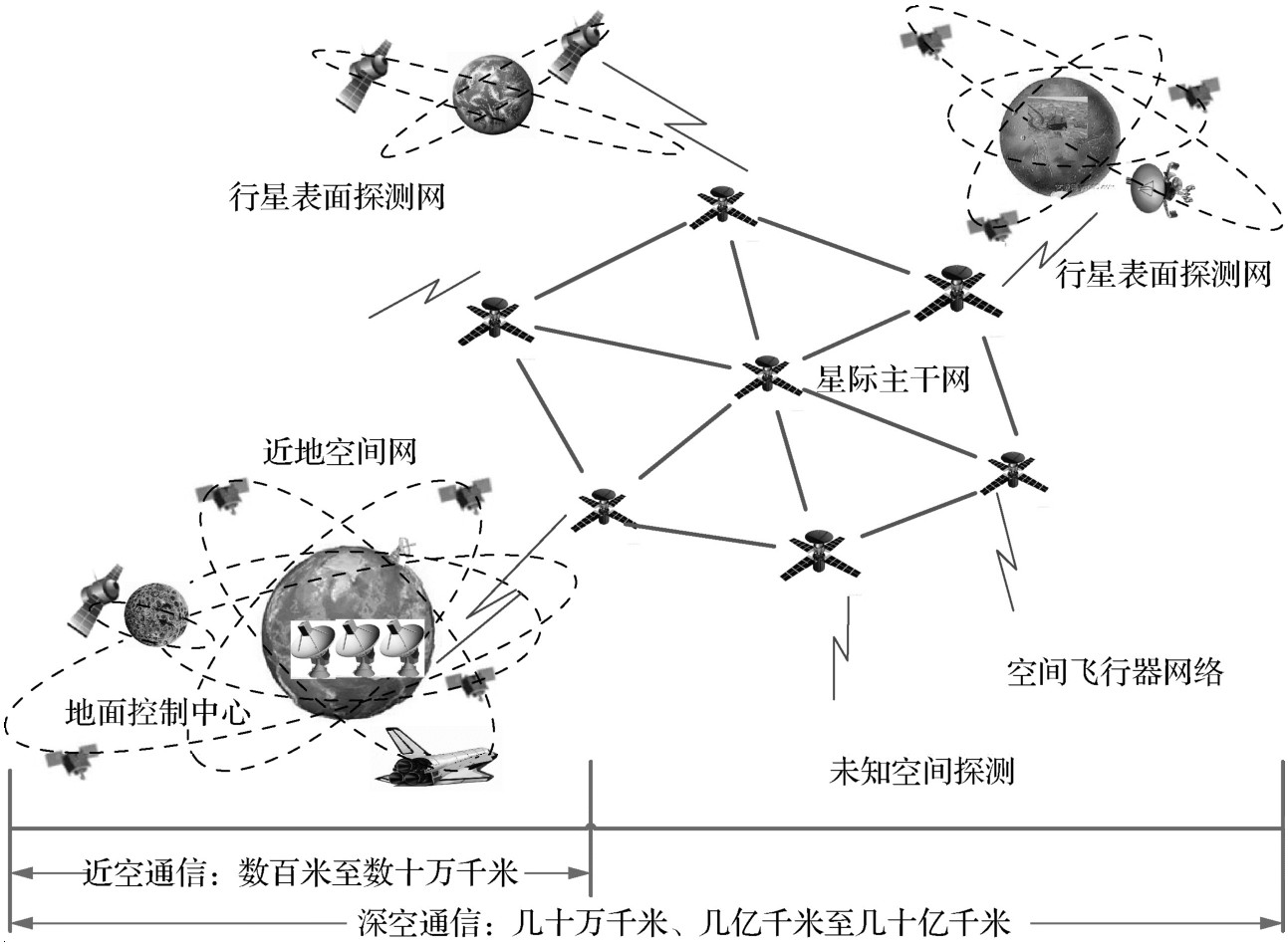 鉴于上述深空通信的特点,在深空实体和地面控制中心之间直接建立可靠通信链路的难度较大。因此,希望能够像地面互联网一样,通过建立深空实体和地面控制中心之间多跳的通信方式,从而避免因连接失败而导致的通信中断 [22] 。从这一点出发,空间数据系统咨询委员会(Consultative Committee for Space Data Systems,CCSDS)从20世纪90年代开始进行深空网络的研究,其目的是建立若干行星附近的近空网络,并通过星际主干网络将这些近空网络连接起来,提高深空网络的通信效率 [23,24] 。