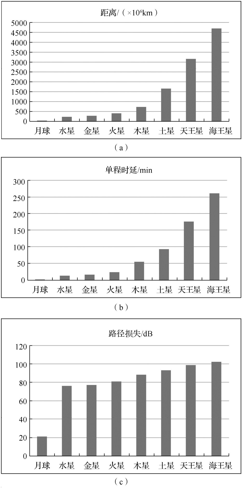 图1-2 地球与太阳系星体通信的一些参数(以对地静止轨道为参考点)(续)