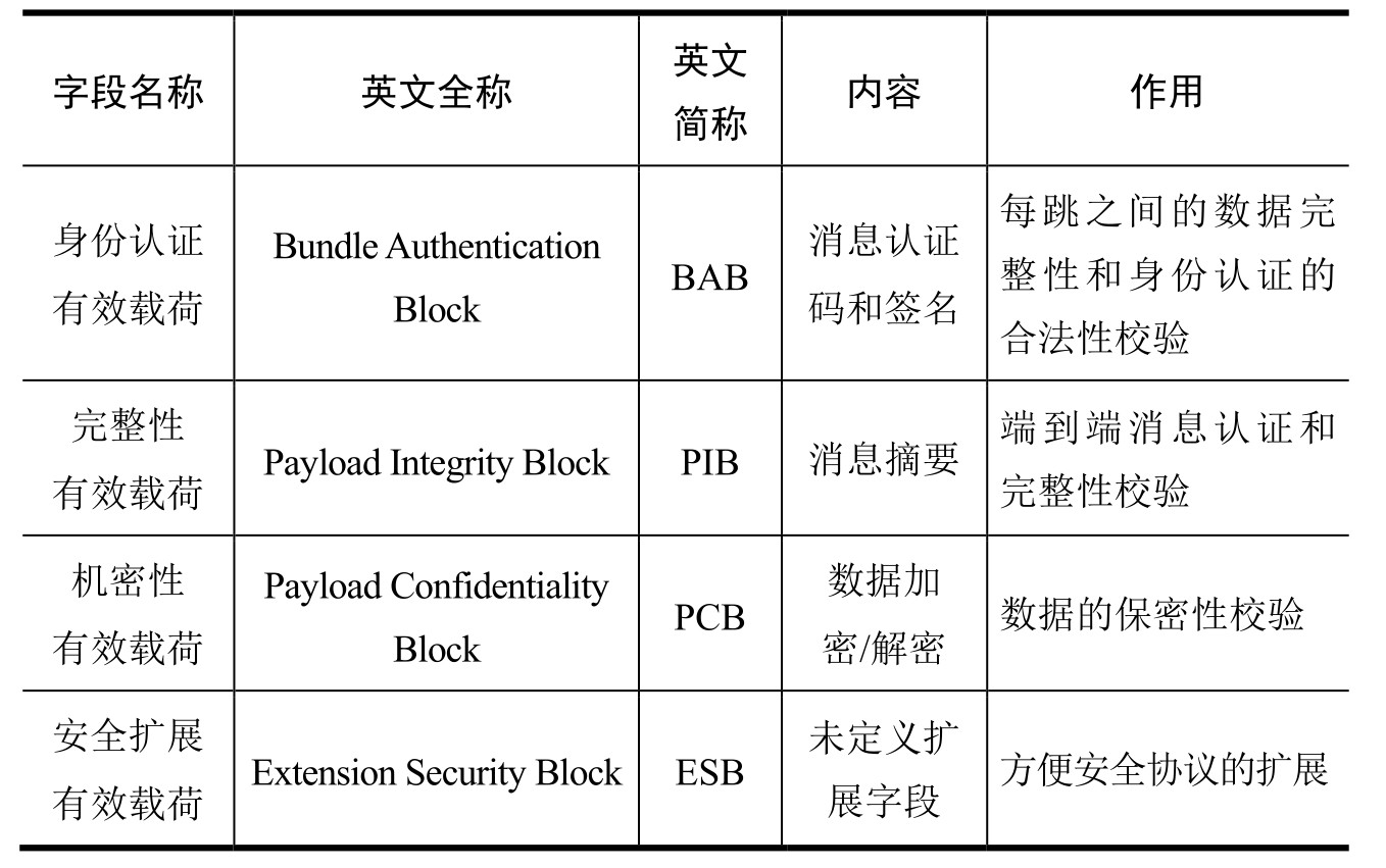 针对DTN的研究,美国喷气推进实验室专门成立了DTN研究组 [50] (Delay Tolerant Networking Research Group,DTNRG),研究制定了DTN体系结构、DTN传输的聚束协议 [51] 和DTN安全聚束协议规范 [52] 。类似TCP/IP协议中的IPSec协议,在DTN安全协议规范中,定义了BAB、PIB、PCB、ESB等安全有效载荷字段,如表2-1所示。尽管该安全结构定义了DTN安全技术的发展方向,但是由于DTN结构的复杂性,仅仅通过该安全聚束协议规范是无法得到充分保障的,而且该规范仍然有很多关键问题亟待解决,如实体认证、密钥管理、隐私保护、路由安全、拥塞控制和分片认证等问题。因此,网络安全问题逐渐成为该领域的研究热点 [53] 。
