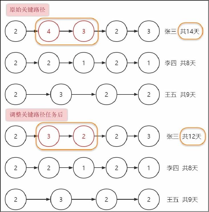 关键路径和关键节点是对开发周期影响最大的,如果关键路径上出了问题,项目最终一定会延期。如果在关键路径上的人员经常被其他事务干扰,例如,线上Bug、人员抽调、请假等,项目就会存在很大的风险。因此,出现需求变更时,尽量避免涉及关键路径。如果要压缩整体开发周期,就需要压缩关键路径的时间,或者拆分关键路径。