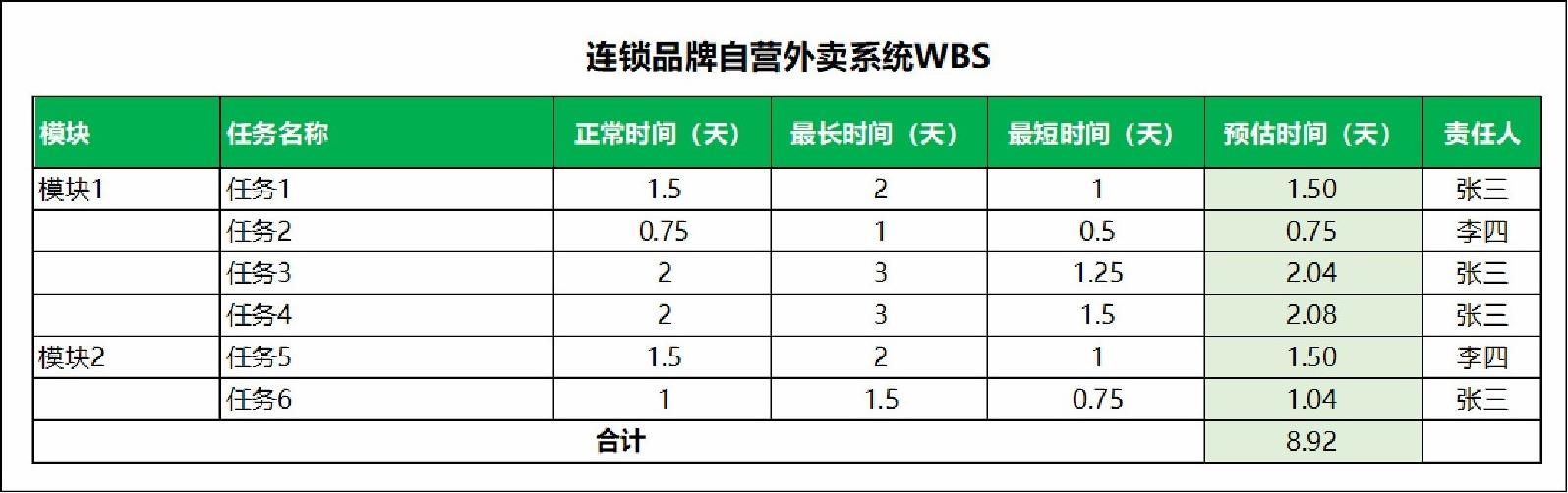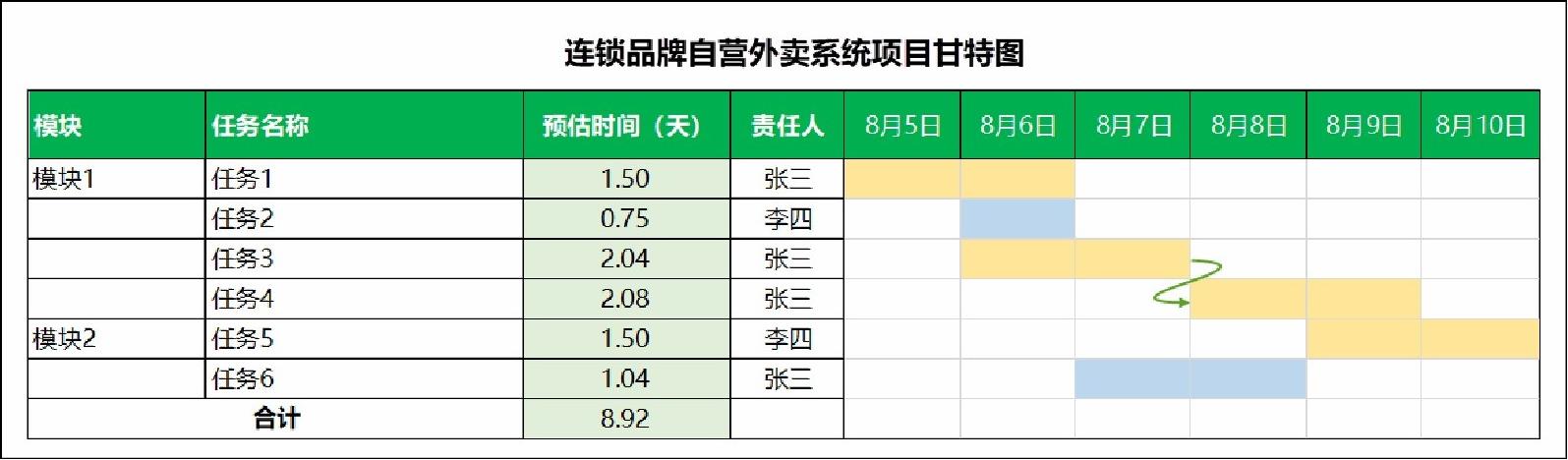 在甘特图中还可以找到关键路径和关键节点,以便把控风险。例如,以每个开发人员为单位,依次把每个人负责的任务作为一个节点连接起来,在每个任务节点上标注预估时间,形成一条路径,把预估时间求和(预估时间可以按照上面的公式计算),然后找到预估时间最长的一条路径,这就是关键路径,关键路径上预估时间最长的一个任务节点就是关键节点。