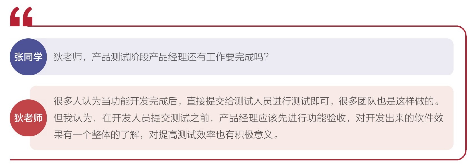 此阶段产品经理的验收不需要非常细致,一般只要按照标准的操作方式操作一遍软件,如果软件的正常流程没有方向性问题,没有重大缺陷影响业务流转,就可以提交给测试人员了。无须过多关注异常流程的操作,异常流程的测试可以交给测试工程师来完成。例如,开发一款电商App,如果连基本的支付功能都无法实现,后续的所有流程都无法进行,这种情况下把软件提交测试是没有任何意义的。 9/WQjZJeGCG3Ei4A0rZJfRLxogwD5GLAqJbimyWRX1Jk+CCqRD9wPpCHHatiLPEo