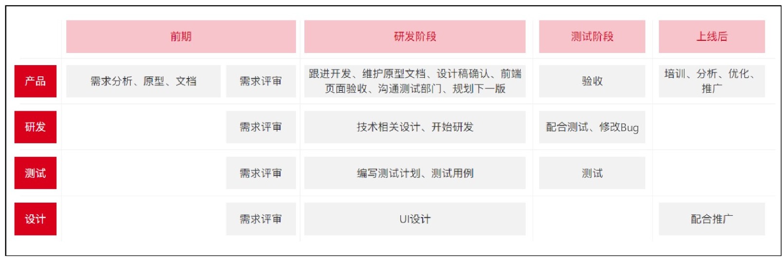 除产品经理外,团队其他岗位的职责在2.1.1小节中也提到了,此处整理了一张示意图,更加清晰直观地展示了各个阶段每个岗位的工作内容。