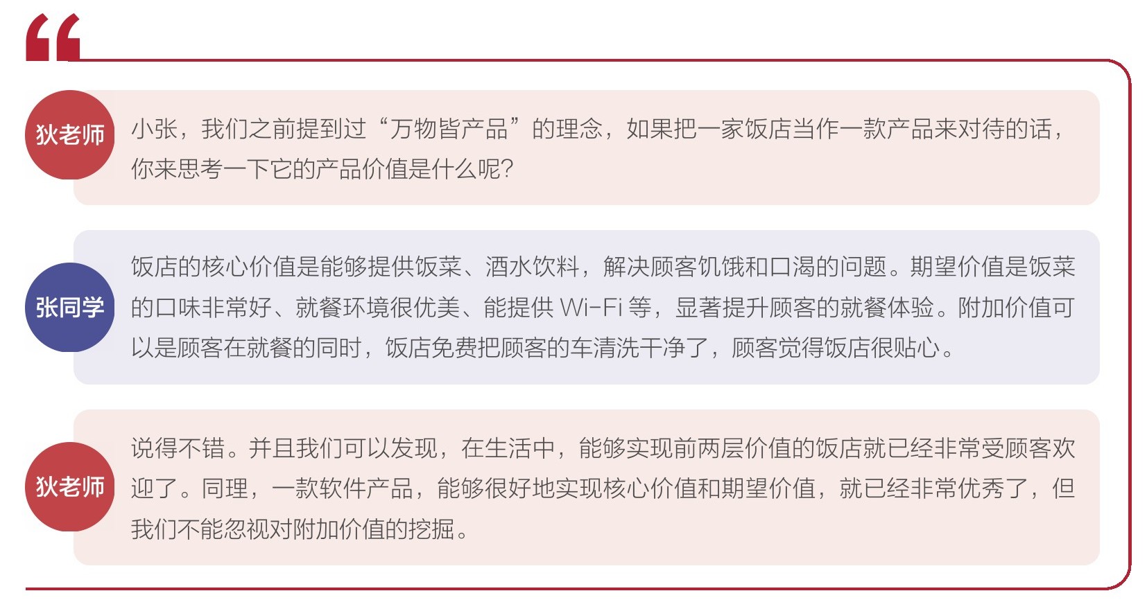 (2)期望价值:产品能够更好地为用户服务,满足用户对高品质工作和生活的需求,如果期望价值做得好,用户黏性就会更高。产品的期望价值就是实现了卡诺(KANO)模型中的期望型需求。例如,微信的期望价值就是能够进行更优质的社交,朋友圈、红包等功能应运而生。