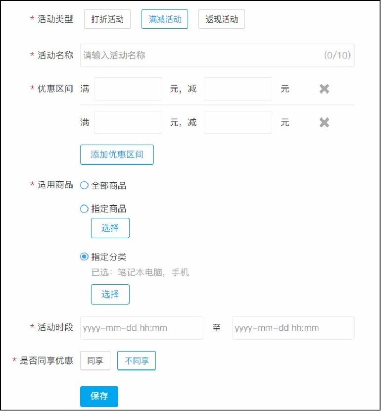 (2)把“促销活动”这种宽泛的说法,具体到某种或某几种可执行的活动形式(如打折活动、满减活动、返现活动),每种活动形式需要哪些维度限制(如活动时间、活动商品、优惠金额等)。