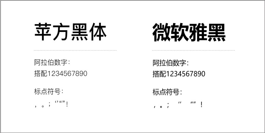 另外,苹方黑体在数字和标点符号的呈现效果上比微软雅黑更优秀。如图3-8所示,苹方黑体在2、3、6等有弧度的数字呈现上,看起来比微软雅黑更圆润,在逗号、引号的呈现上,也更符合印刷品中的中文标点符号特点。