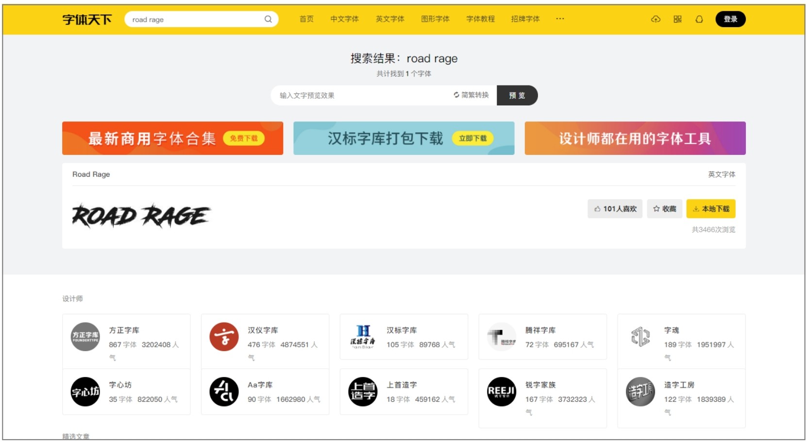 前文推荐了不少字体,在哪里可以下载呢?当你知道字体名称时,可以到一些字体“市场”网站中去搜索下载。这类网站聚合了各大字体设计公司出品的中文、英文字体,只要知道字体名称基本都能找到。这里推荐大家使用“字体天下”网站,该网站设计简洁,没有过多的广告干扰,字体分门别类十分清晰,字体库也较全,搜到字体后基本都有下载链接,如图3-50所示。