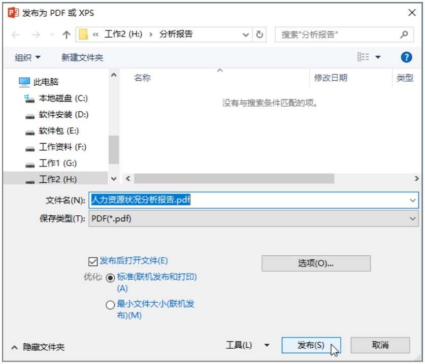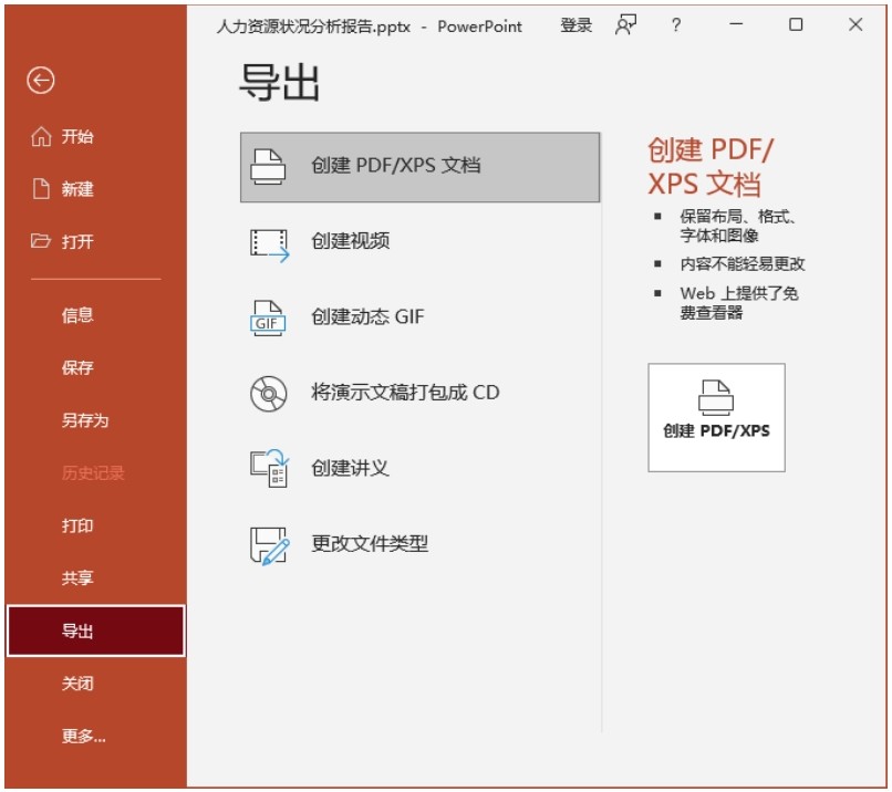 将PPT文件保存为PDF文件的具体方法:选择“文件”→“导出”命令,在窗口右侧单击“创建PDF/XPS 文档”按钮,如图3-42所示。弹出“发布为PDF 或 XPS”对话框,对保存位置进行设置,然后单击“发布”按钮即可,如图3-43所示。