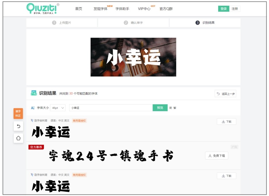 另外,还推荐一个叫作“求字体”的字体“市场”网站。这个网站有以图搜字体的功能,类似百度的以图搜图,当你在别人的PPT中看到某个字体时,如果想找到这个字体,可以截图或拍照保存,到这个网站上传搜索,就能够找出字体名称,如图3-51、图3-52所示。