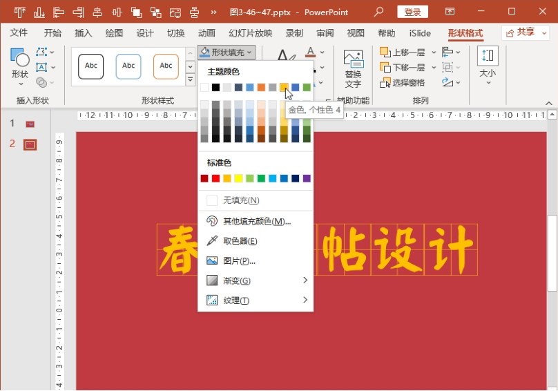 步骤 02 标题文字转换成了矢量形状。变成形状后的文字虽然和PNG图片一样,不能再改变文字内容,但可以改变填充色、边框色,如图3-47所示。