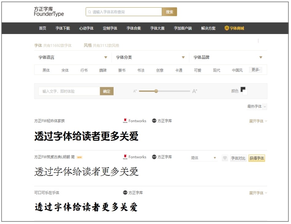 最简单的就是直接访问字体设计公司官网,可以了解该公司字体的使用权限、最新的字体设计作品。通常,个人学习使用的情况下也都是可以直接下载字体的,如图3-48、图3-48所示。