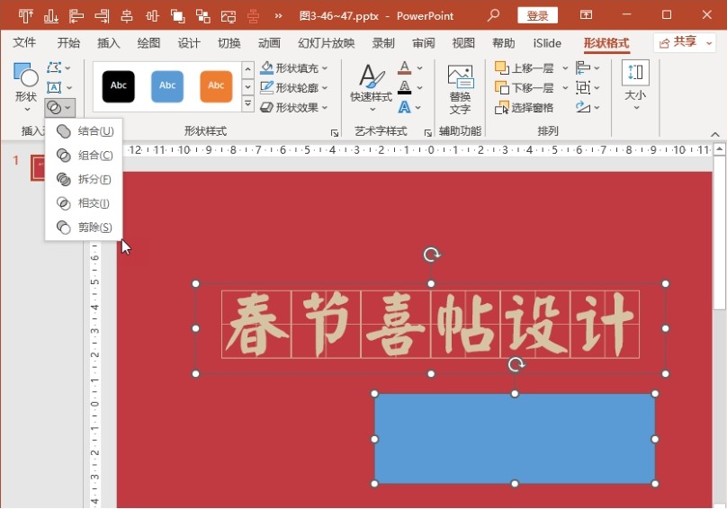 将文字转换成PNG 图片后,始终不如原来的矢量文字清晰,怎么办?在可能缺失字体的文字不多的情况下,我们还可以选择“合并形状”命令,将文字转换成形状。这样既能保证文字不出现字体缺失问题,同时仍然具有矢量图形的清晰度。这种方式类似于CorelDRAW 软件中的转曲操作。