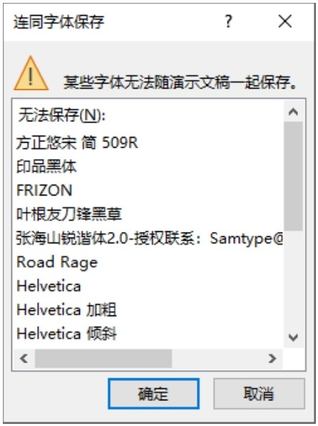 PPT 中使用到的某些特定字体,并不适用该方法,保存时可能会弹出“连同字体保存”对话框,提示“某些字体无法随演示文稿一起保存”,如图3-40所示。此时须用其他方法来确保PPT在其他计算机上播放时不发生字体改变。