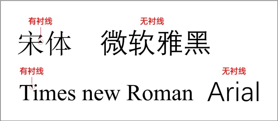 传统中文印刷中字体可分为衬线字体和无衬线字体两种,这两个概念最早来源于西方国家。衬线字体(Serif)是指在字的笔画开始、结束的地方有额外的装饰,而且笔画的粗细会有所不同的一类字体,如宋体、Times New Roman;无衬线字体是指没有这些额外的装饰,而且笔画的粗细基本一致的一类字体,如微软雅黑、Arial,如图3-5所示。