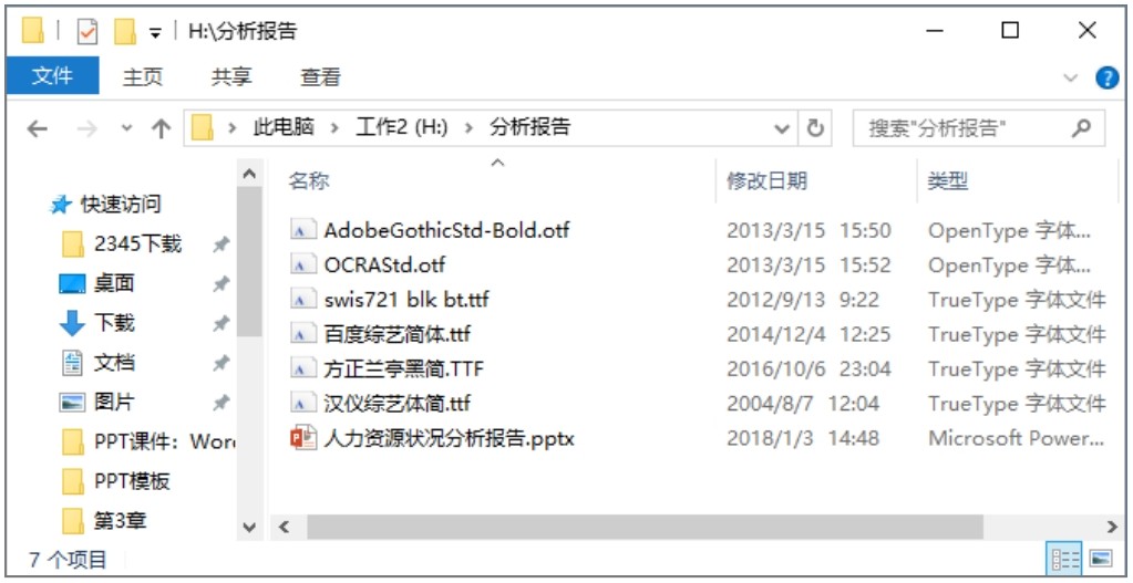 将PPT 中应用的所有字体随PPT 文件一起复制到别人的计算机中,如图3-41所示。如果出现字体缺失问题,则将字体安装至该计算机中,然后重新打开PPT 文件即可。如果认为在字体库中找字体、复制字体不烦琐,这是解决字体缺失问题最为简单、直接的办法。