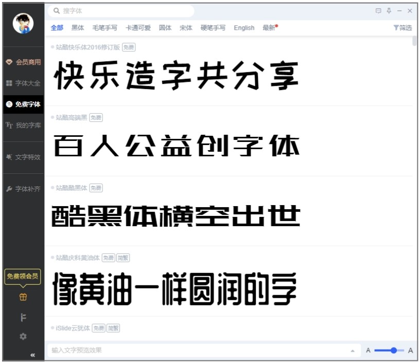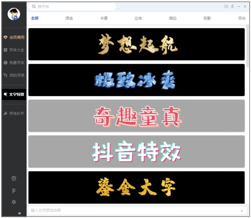 这是一个集字体管理、字体下载等字体相关功能于一体的软件,如图3-53所示。通过这个软件我们可以轻松找到各大字体设计公司的字体,了解该字体的使用权限(是否能商用一目了然),一键应用到目标文字内容(当前选中)中,并且能够分门别类地管理你电脑中已有的字体,在打开别人的PPT遇到缺少字体的问题时,还可以通过这个软件快速将字体补回来,确保正常显示。另外,当我们需要做一些常见的特效文字(比如金属字、抖音特效字、荧光字、流体渐变字等)时,通过这个软件也可以快速完成。使用方法也很简单,拖到PPT中使用即可,非常便捷,如图3-54所示。